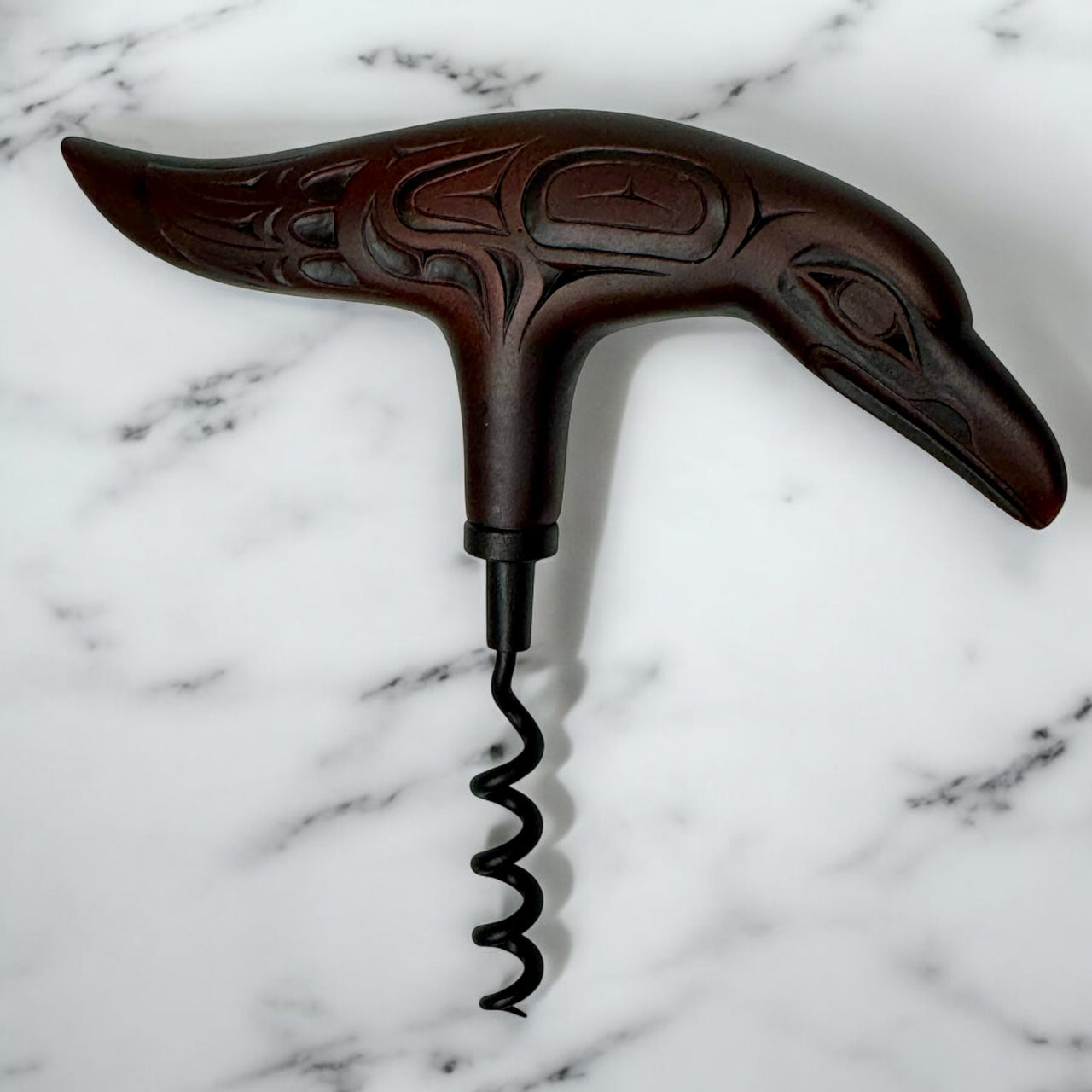 This ergonomically balanced cork pull has a carved recycled glass handle with a Teflon coated screw. The Raven, carved by Mark Garfield, is ""the trickster"", powerful, intelligent and curious. Raven is the creator of the world and symbolizes prestige and knowledge.