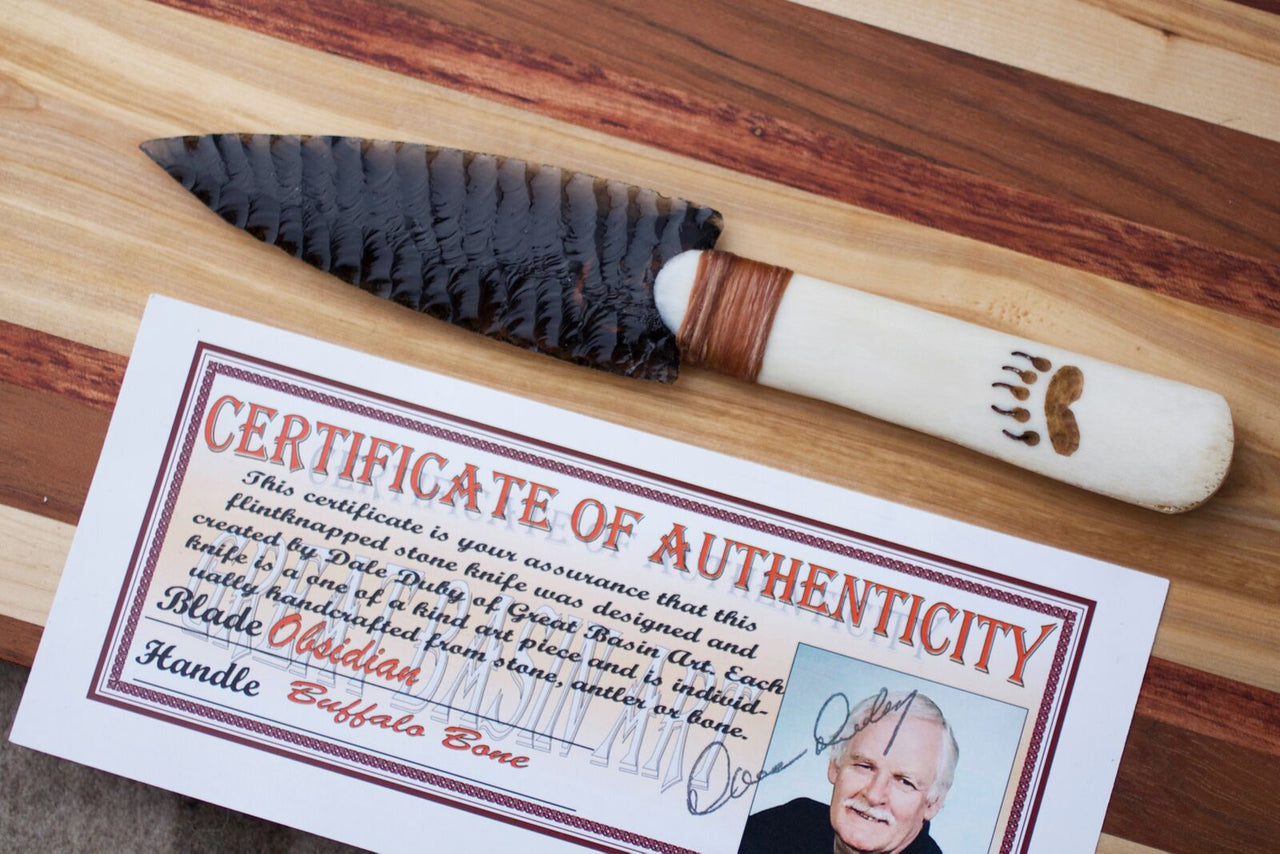 Handle is Buffalo Bone and blade is made of Obsidian.