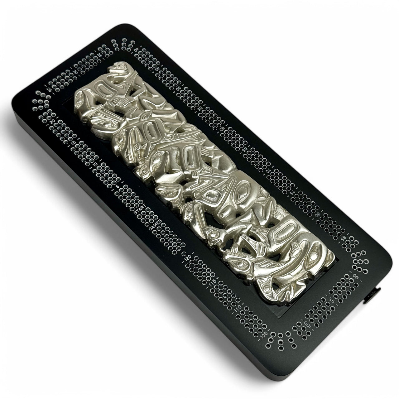 The inlay of this cribbage board is carved in the traditional panel pipe styling. It is based on the Northwest Coast natives' ceremonial panel pipe used in special events. If you look closely at the designs you can see many of the figures that are the cornerstone of Northwest coast artwork and culture.