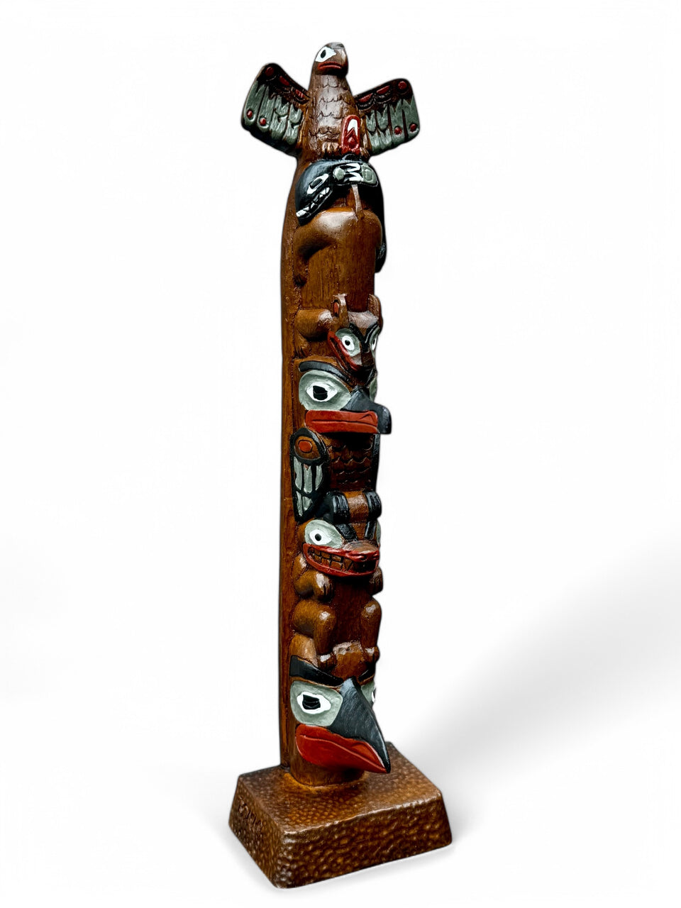 Beautifully carved and painted, this totem features the Eagle, Whale, Raven and Bear.