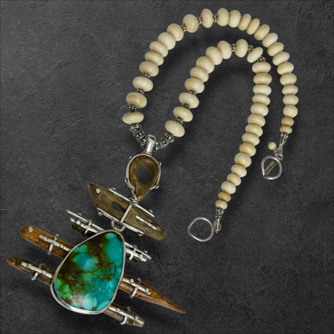 Fossil Walrus Ivory, Raw Emerald & .925 Sterling Silver Necklace