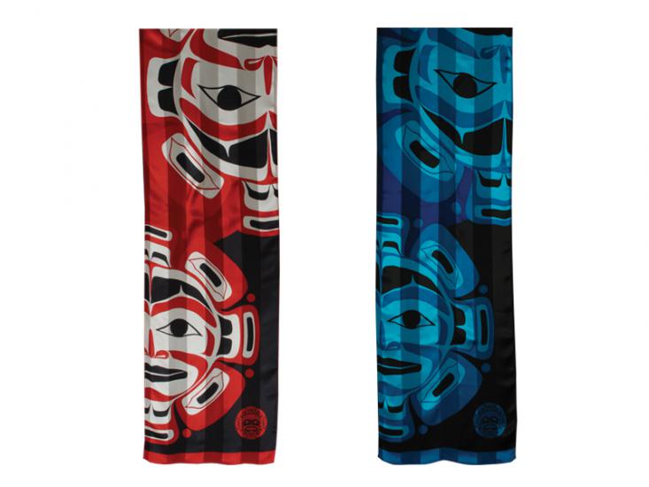These beautiful silk satin stripe scarves feature the Moon Mask of Klatle Bhi and are available in two stylish color ways: Red/Black or Teal.