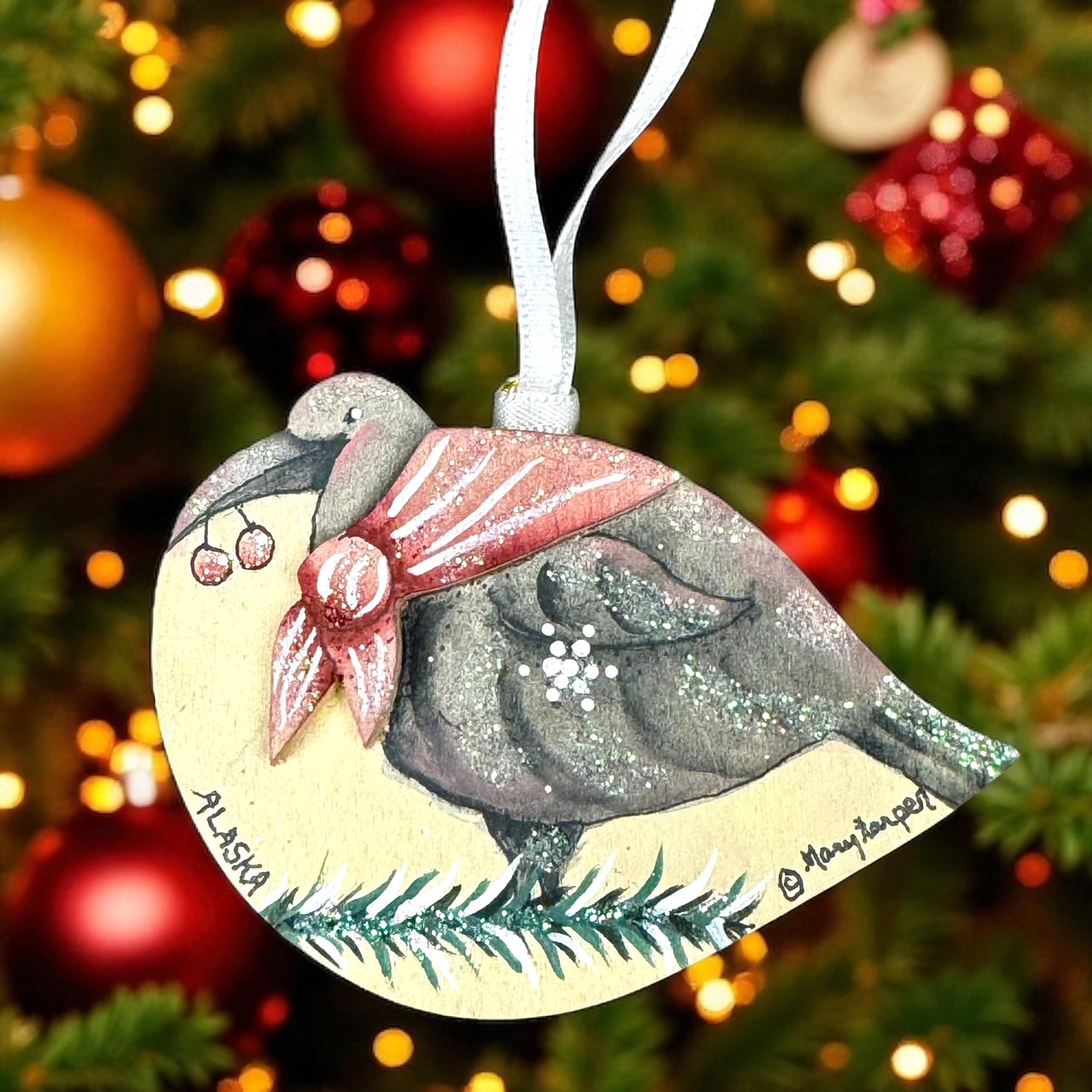Each ornament is cut out of Alaskan wood, attached with ribbon, hand painted, glittered and signed by Mary. A card is attached to each keepsake with a description.