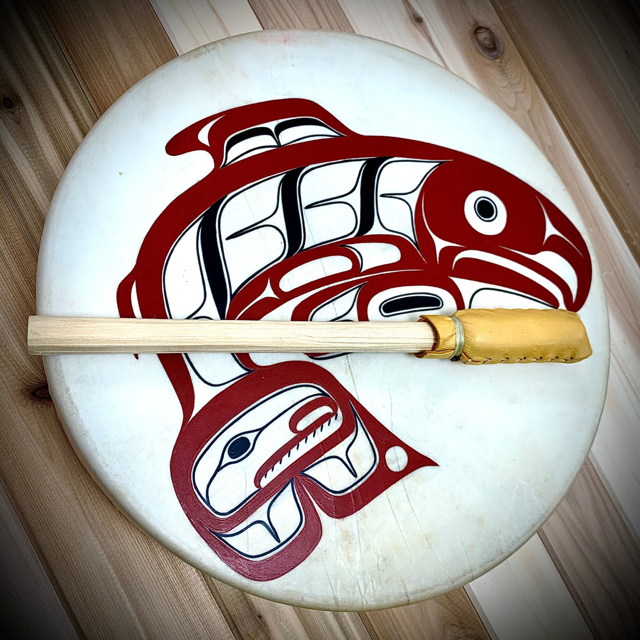 Handcrafted Deerskin 14" drum is hand painted by renowned Native Alaskan artist, David Boxley