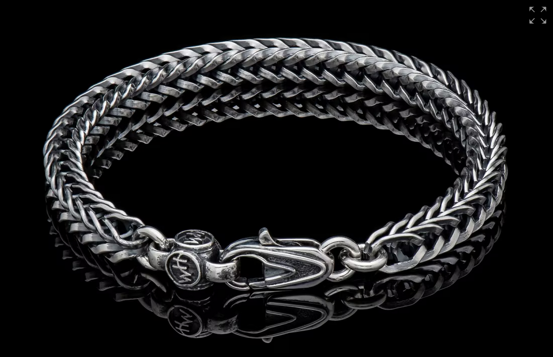 Bold, supple, fluid, snakelike, this foxtail chain in sterling silver is in a league of its own. Beautifully oxidized and hand polished, this complex pattern flows around the wrist and draws the eye closer. There are a great many foxtail pattern chains out there, but precious few that rise to the level of art on their own. Finished with our custom lobster clasp and available in a variety of sizes.