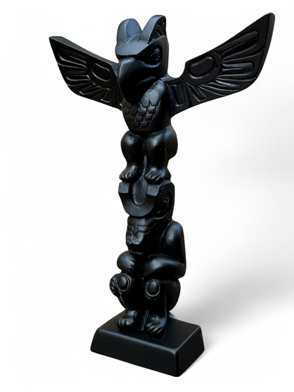 The Northwest Coast Natives have a perception of oneness of all earth's creatures, human and animal. They believe that humans may transform into animals, birds, fish and mythical creatures and back again. Once transformed they take on the essence and spirit of that being, Their art reflects this transformation. Made of black crushed marble, this pole is available in 5 sizes and features the Thunderbird with outstretched wings and Wolf.