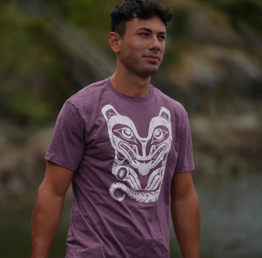 Design by Haida Artist Jesse Brillon, Printed on a Heather Maroon shirt soft polyester-cotton blend with water based ink for a extra soft hand feel,